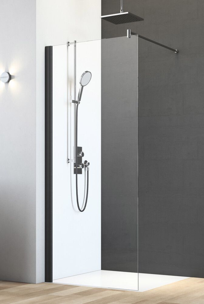 Musta alumiiniumprofiiliga läbipaistvast turvaklaasist valmistatud dušisein.