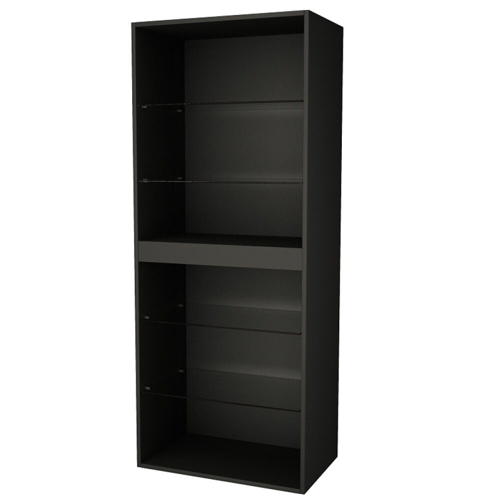 Kõrge kapi karkass nelja klaasist riiuliga. Saadaval matt musta, matt halli, matt valge ja läikiva valgena. 44,8 cm sügavus võimaldab hoiustada kapis ka suuri saunalinu.