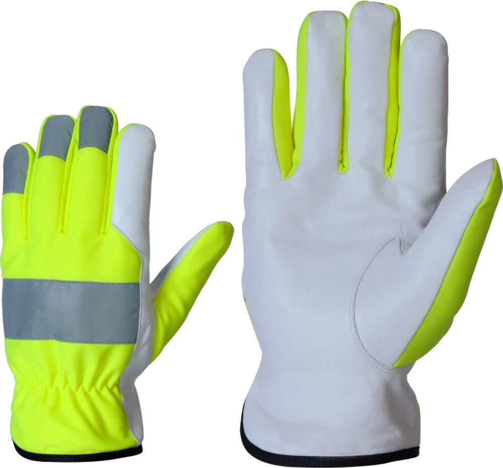 Väga hea kõrgnähtavusega töökindad. Kvaliteetsest kitsenahast peopesa ja sõrmeotsad. Nailonriidest käeseljale on õmmeldud helkurribad. Sees fliisvooder.