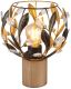 Atraktiivne tassikujuline valgusti on kaunistatud filigraansete lehtede ja sädelevate kristallidega, mis lisavad elegantsi ja sära. Pruun puidust korpus loob sooja ja naturaalse ilme, samas kui kuldne ja patineeritud must metallvari toob esile stiilse kontrasti.