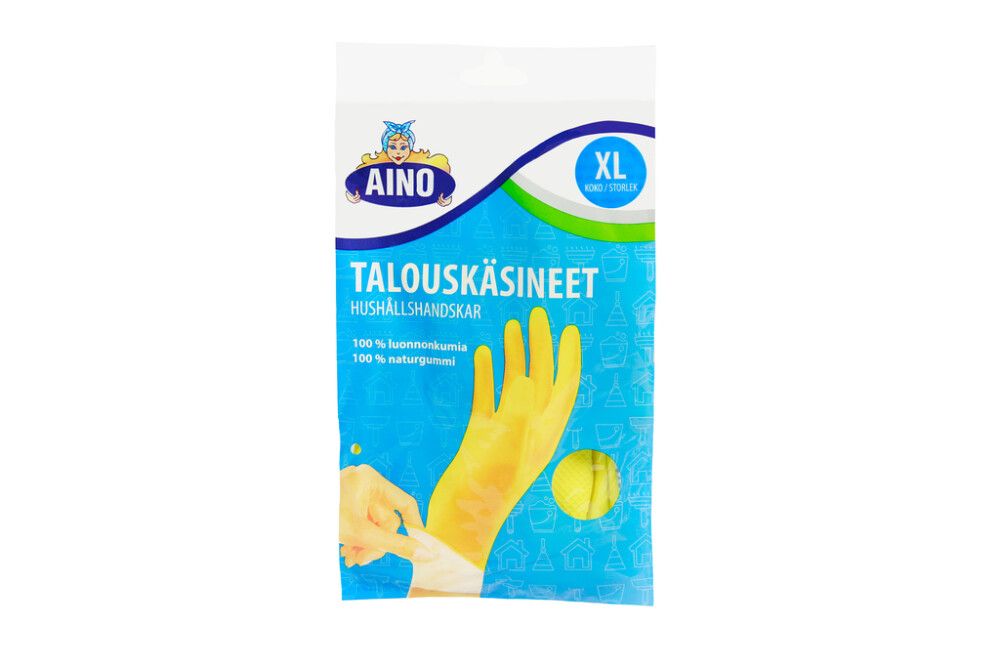 Aino majapidamiskindad on seest puudriga kaetud. Karestatud peopesa tagab kindla haarde. Majapidamiskindad kaitsevad käte nahka kemikaalide eest. Tänu pikale käepidemele sobivad kindad suurepäraselt näiteks nõudepesuks ja vannitoa või akende pesemiseks. Saab kasutada ka aiatöödeks. Kinnaste all saab kanda Aino puuvillaseid aluskindaid.