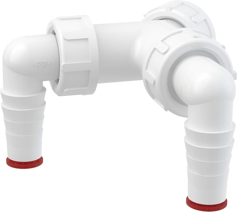 Valge plastikust kahene ühendus tagasilöögiklapiga pesumasinale.