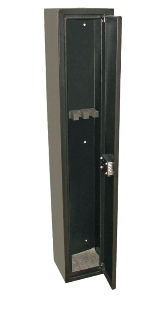 Must relvakapp neljale relvale. 1 riiul, võtmega lukk, 3 polti, 2 võtit, terasraam ja uks. Relvakapp on varustatud sobivate ankrupoltidega (6 tk) ja 2 võtmega.