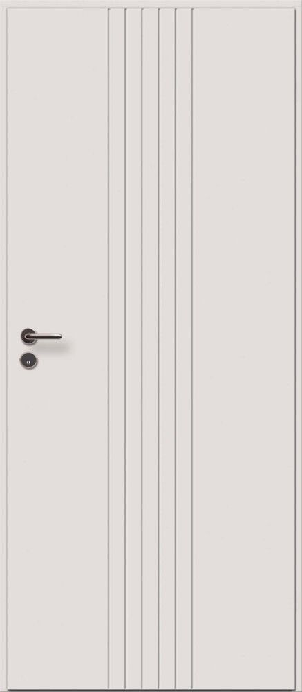Valge, freesitud vertikaalsoontega. Ukse käelisus on muudetav.